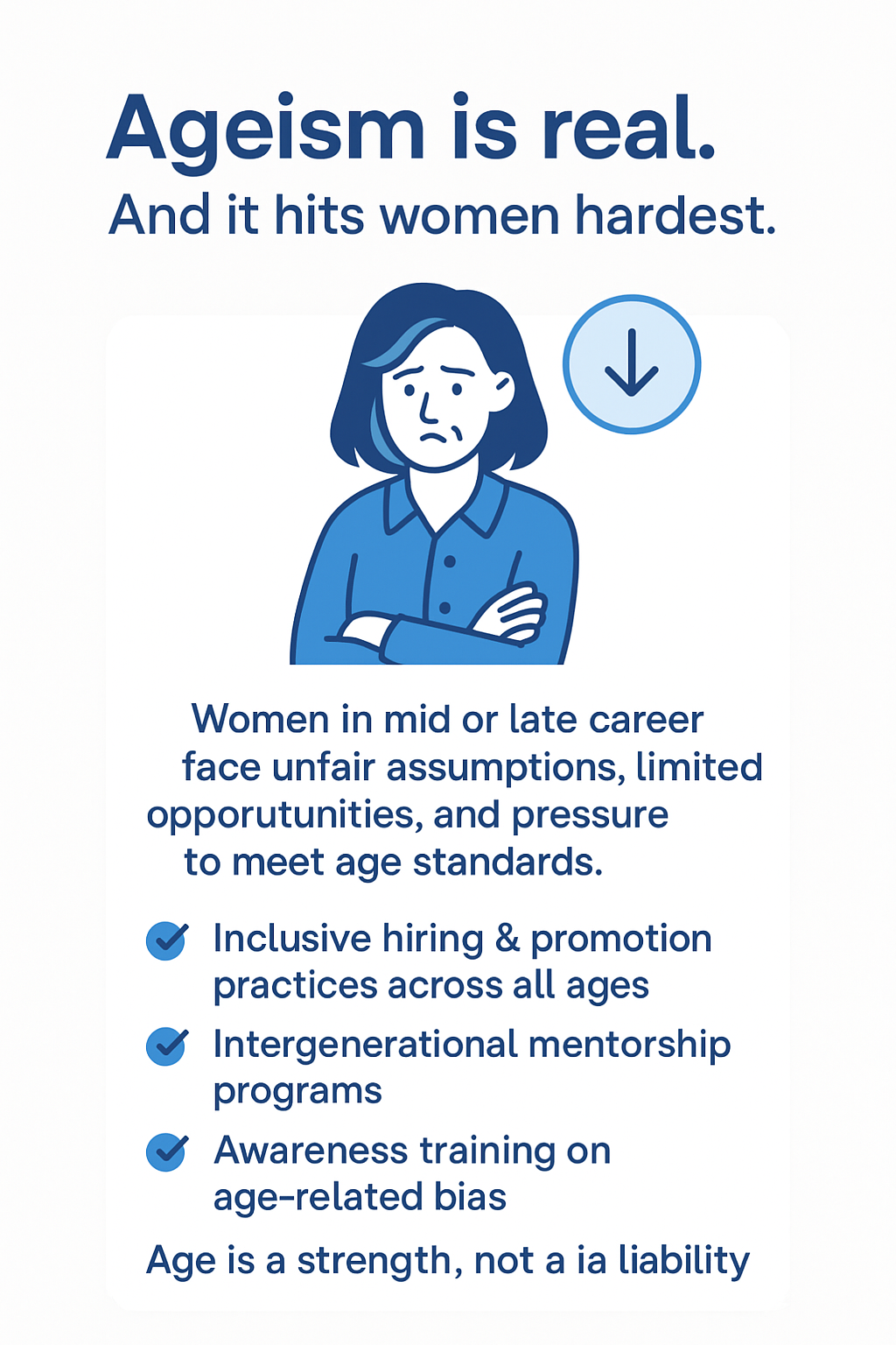 Women, especially those in mid or later stages of their careers, encounter unfair assumptions, limited growth opportunities, and pressure to meet unrealistic age standards — a bias often worsened by race or caregiving duties.