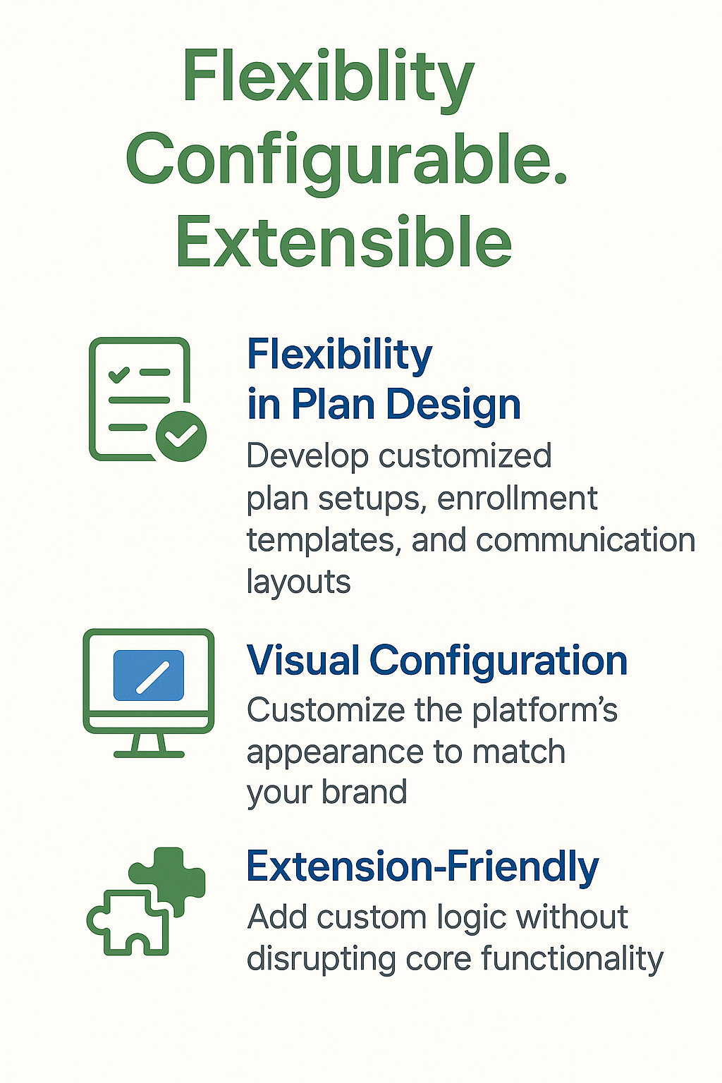 - Flexibility in Plan Design: Develop customized plan setups, multiple enrollment templates, and branded communication layouts.