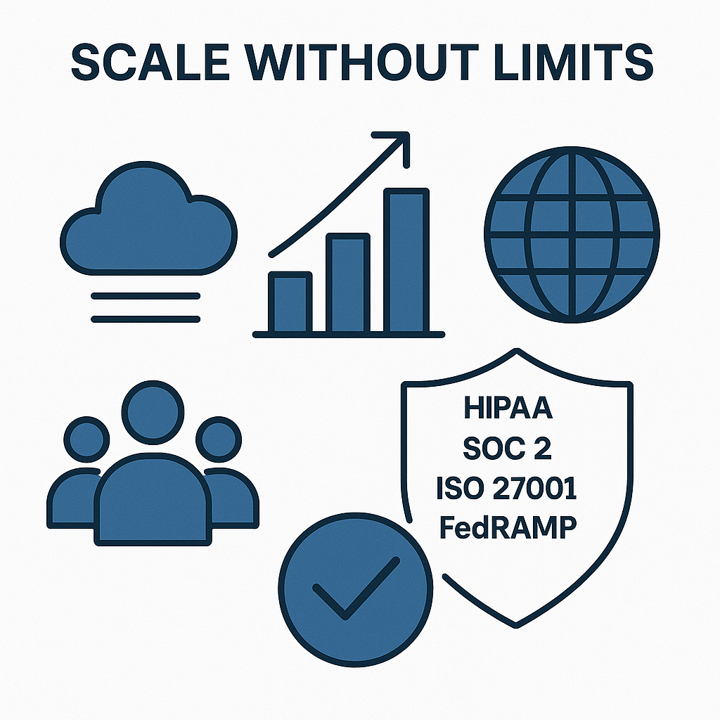- Compliance with HIPAA, SOC 2, ISO 27001, GDPR, and FedRAMP